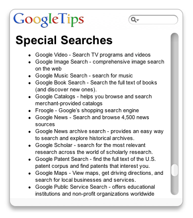 Get the best Google Tips for your everyday Google use right from your Mac OS X Dashboard.